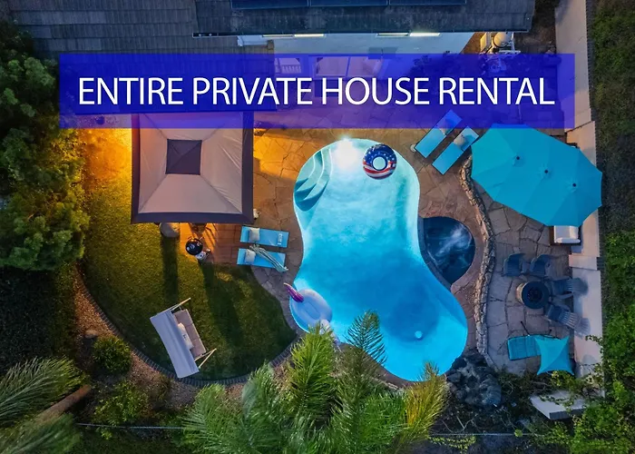 La Entire Private Home With 3 Bedrooms, Hot Tub, King Bed, Garage, Grand View, Available Now dispone de una cocina bien equipada, una zona de comedor y un comedor al aire libre. En la cocina también hay hervidor eléctrico, horno y menaje de cocina. El restaurante McDonald's se encuentra a tan solo 450 metros. Esta casa de vacaciones también está a unos cuantos pasos de la parada de autobús Rancho Penasquitos Boulevard & Paseo Montril.